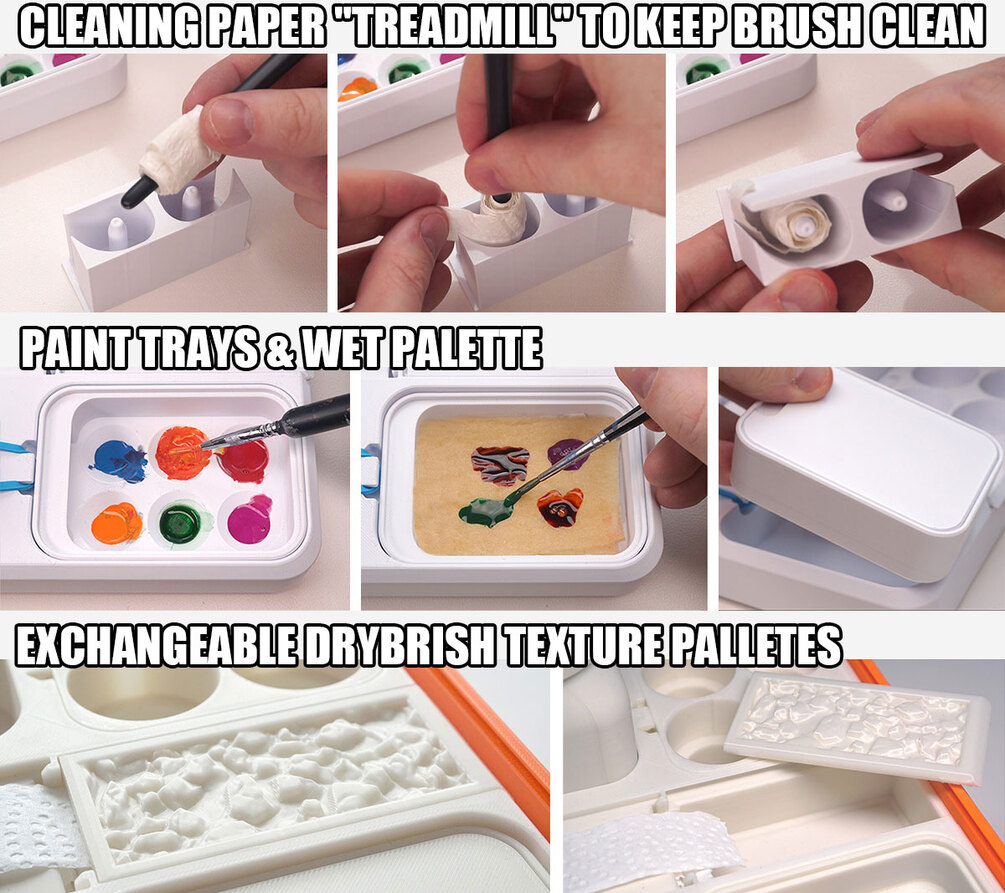 - The cleaning paper "treadmill" helps remove excess paint from brushes. It features two chambers: when one is used up, rotate it to use the second chamber. Pre-cut the paper towel to the desired width, roll it around the brush, and slide it into the chamber. Once the visible towel is used, slide it to the right side to dispose of it in a hidden space under the texture palette! Each chamber holds about ~100cm / ~40 inches of paper towel, depending on thickness. You can prepare it in advance, and an additional unit can be printed and stored in the crate.