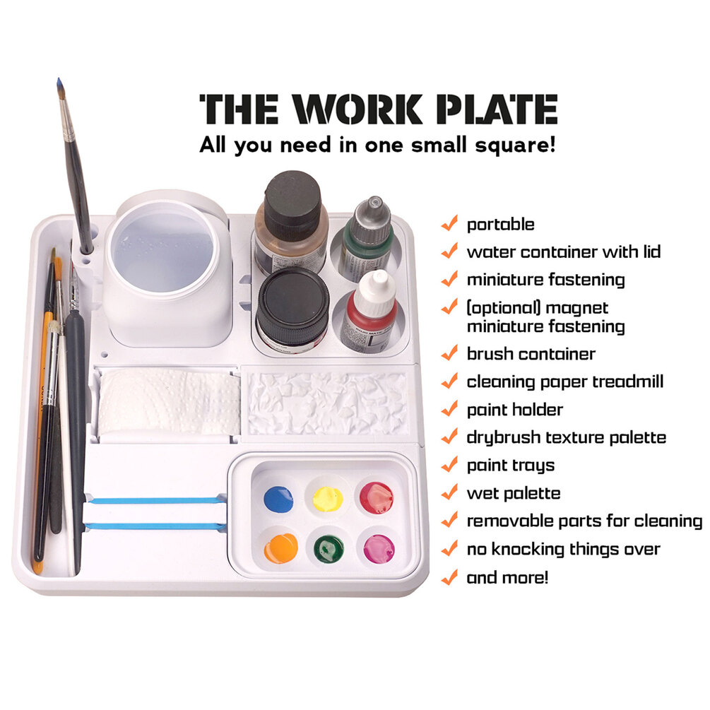 - The crate protects and securely stores the work plate and your tools, water container, paints, and minis. The lid slides out and fits into a lower slot, allowing the work plate to sit on top. The lid snaps into place and only opens fully when about 80% open, preventing accidental spills and keeping your items safe.