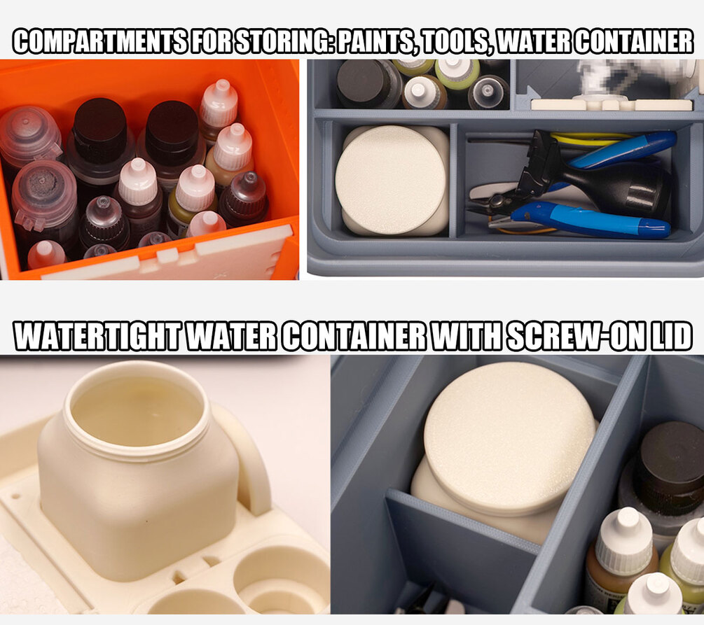 - The water container with a screw-on lid is waterproof (print with 100% infill) and can be used to clean your brushes. The crate has a designated slot for it. Alternatively, you can use a rubber band to secure your own water container and hold it in place. Maximum size for custom containers: 59mm x 59mm / 2,32 x 2,32 inch.