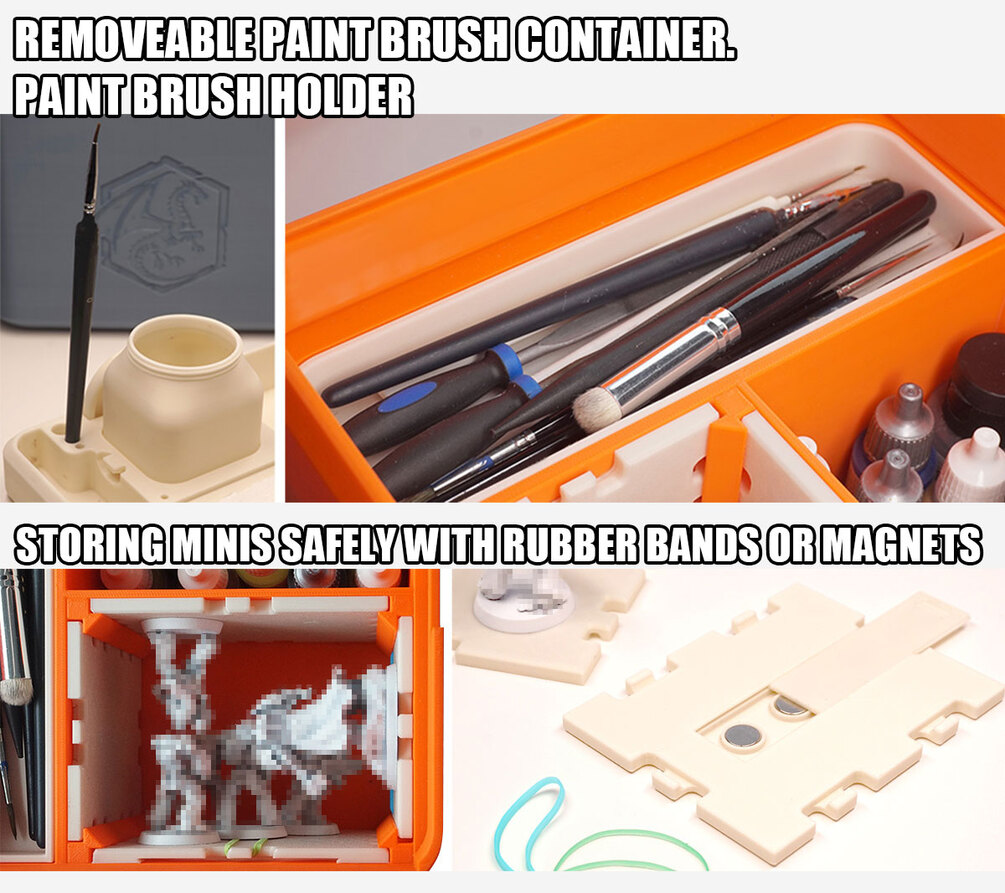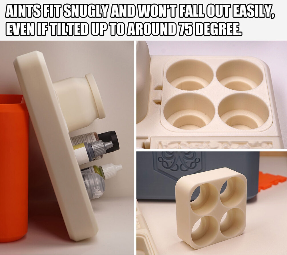 • The water container with a screw-on lid is waterproof (print with 100% infill) and can be used to clean your brushes. The crate has a designated slot for it. Alternatively, you can use a rubber band to secure your own water container and hold it in place. Maximum size for custom containers: 59mm x 59mm / 2,32 x 2,32 inch.