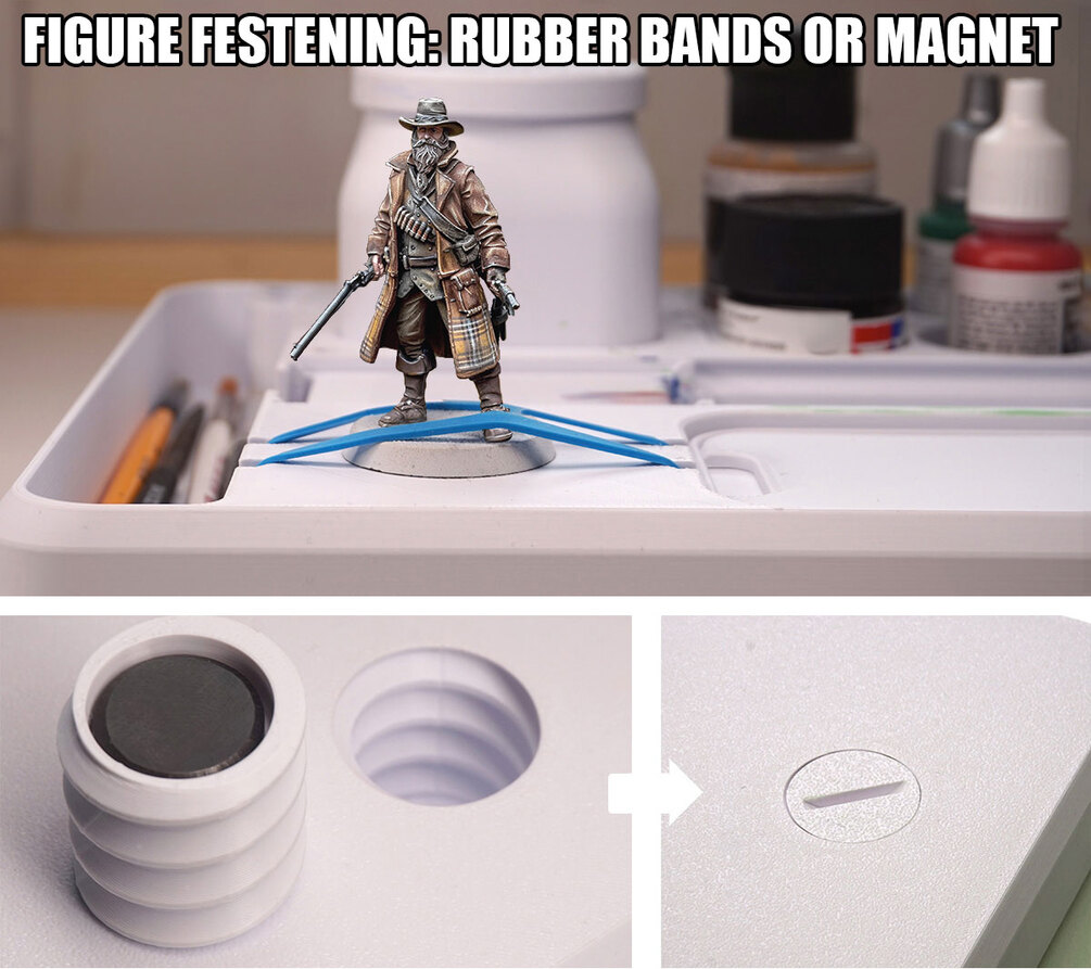 • Miniature fastening: rubber bands or magnets! A magnet (10mm x 3mm or smaller) (0,39 x 0,11 inch or smaller) can be secured to the bottom of the work plate using a 3D-printed hollow screw - no tools or glue are needed. Just use the wet palette lid or a coin to twist the screw in place with the magnet inside. Alternatively, use rubber bands for miniatures without magnetized bases. Miniatures with bases up to 67mm x 67mm (2,63 x 2,63 inches) fit in the dedicated area on the work plate. Larger bases may extend beyond this area but can still be accommodated to some extent.